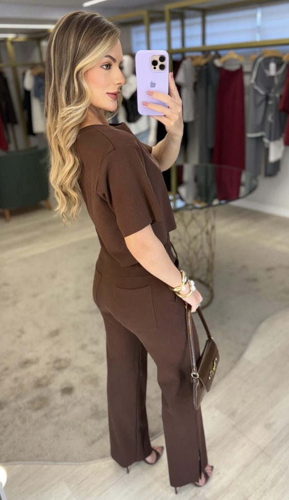 Conjunto mara composto por blusa cropped manga curta e calça com detalhe de abertura na barra. Em tecido moleitinho super confortável. A calça é cintura alta e tem bolsos tanto nas laterais quanto atrás, super prática, né? Perfeito pra montar aquele look descolado e estiloso, seja para sair com as amigas ou arrasar no rolê.