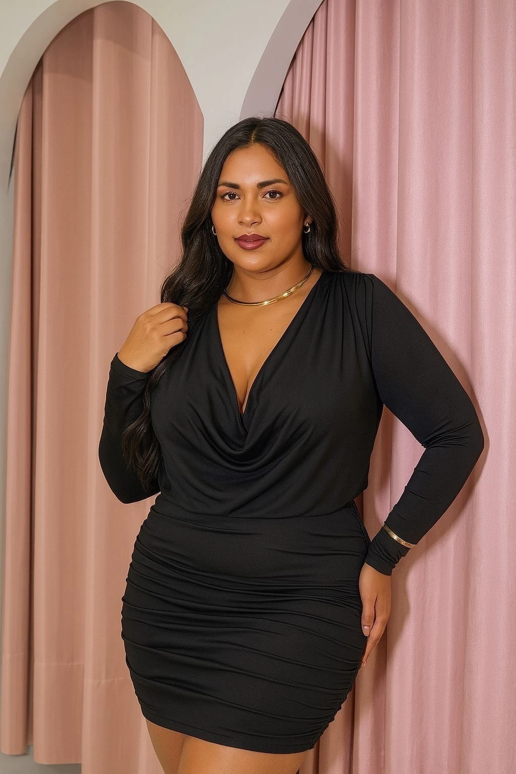 Confeccionado em poliamida de alta qualidade, este vestido curto possui manga longa e um elegante detalhe em caimento na frente, que valoriza a silhueta com um toque de sofisticação. Seu tecido leve e com elasticidade proporciona um ajuste perfeito, com muita praticidade.