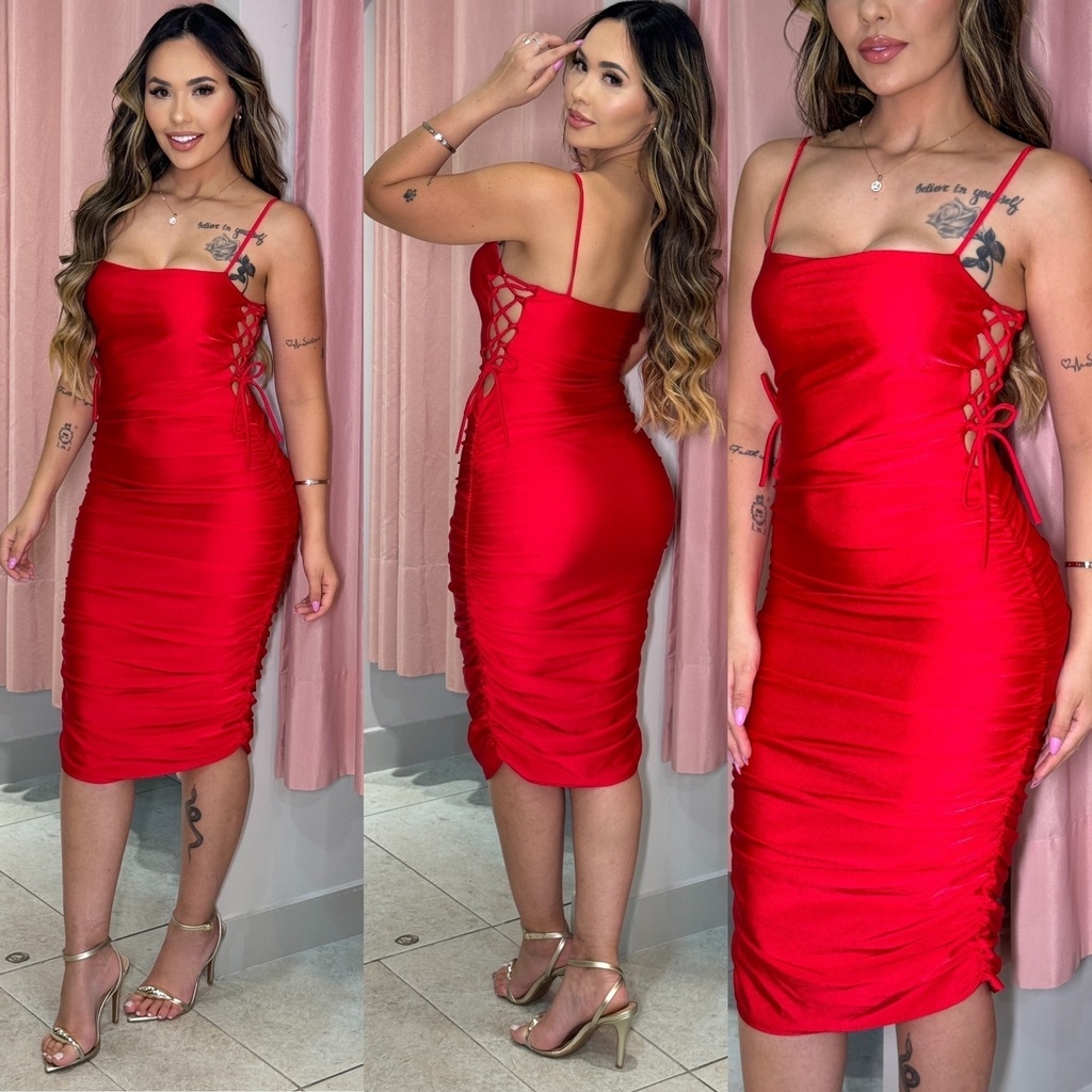 O detalhe drapeado na lateral não apenas realça a beleza do modelo, mas também evita marcas indesejadas. Com alças finas e um fecho em laço na lateral, o Vestido Marina é sinônimo de charme e sofisticação.